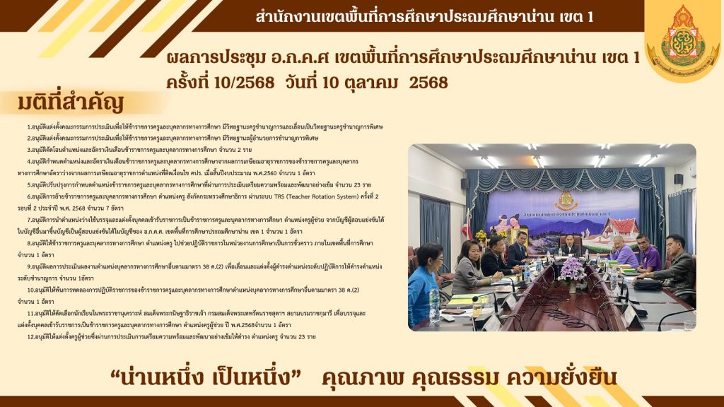 ประชุม อ.ก.ค.ศ เขตพื้นที่การศึกษาประถมศึกษาน่าน เขต 1 ตุลาคม 10, 2025ตุลาคม 10, 2025admin วันที่ 10 ตุลาคม 2568 เวลา 09.00 น. สำนักงานเขตพื้นที่การศึกษาประถมศึกษาน่าน เขต 1 ประชุม อ.ก.ค.ศ เขตพื้นที่การศึกษาประถมศึกษาน่าน เขต 1 ณ ห้องประชุมคุณากร #น่านหนึ่งเป็นหนึ่ง #คุณภาพคุณธรรมความยั่งยืน