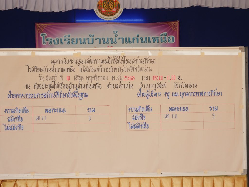 มีมติเป็นเอกฉันท์ ของฝ่ายคณะกรรมการสถานศึกษาขั้นพื้นฐาน และฝ่ายผู้บริหารสถานศึกษา ครูและบุคลากรทางการศึกษา ใช้สิทธิออกเสียงลงคะแนนแสดงความสมัครใจให้ถ่ายโอนโรงเรียนบ้านน้ำแก่นเหนือ ไปยังสังกัดองค์การบริหารส่วนจังหวัดน่าน