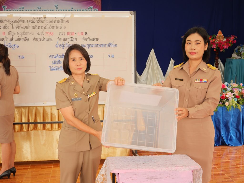 วันที่ 10 พฤศจิกายน 2568 เวลา 09.00 น. นายธวัชชัย ยวงคำ รองผู้อำนวยการสำนักงานเขตพื้นที่การศึกษาประถมศึกษาน่าน เขต 1 ร่วมการดำเนินการหาความสมัครใจให้โอนสถานศึกษาขั้นพื้นฐาน “โรงเรียนบ้านน้ำแก่นเหนือ” อำเภอภูเพียง จังหวัดน่าน ไปยังสังกัดองค์กรปกครองส่วนท้องถิ่น ในปีการศึกษา 2569 ณ หอประชุมโรงเรียนบ้านน้ำแก่นเหนือ โดยมีนายสมเกียรติ รัตนวิฑูรย์ ผู้ทรงคุณวุฒิ ในคณะกรรมการศึกษาธิการจังหวัดน่าน เป็นประธาน