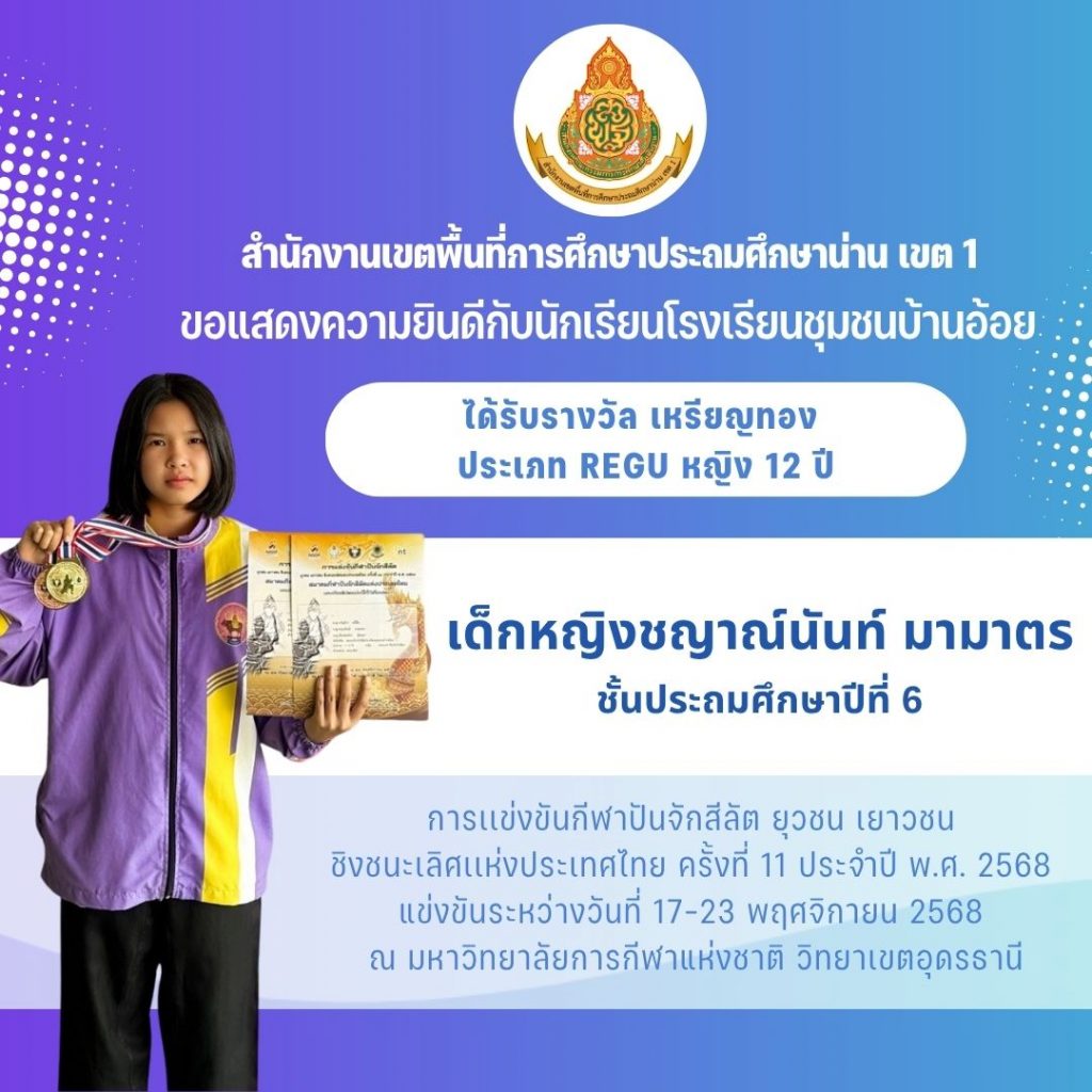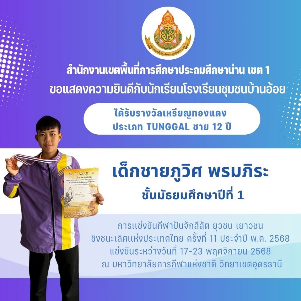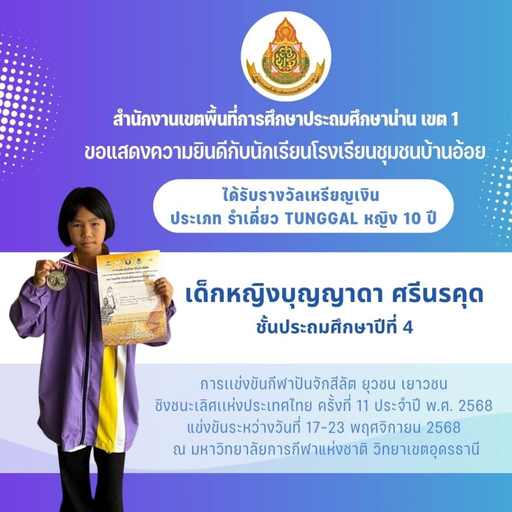 สำนักงานเขตพื้นที่การศึกษาประถมศึกษาน่าน เขต 1 ขอเเสดงความยินดีกับโรงเรียนชุมชนบ้านอ้อย ภายใต้การนำของนายศรันย์ พงษ์รัตนานุกูล ผู้อำนวยการโรงเรียน ที่ได้นำทีมชมรมปันจักสีลัตโรงเรียนชุมชนบ้านอ้อยเข้าร่วมการเเข่งขันกีฬาปันจักสีลัต ยุวชน เยาวชน ชิงชนะเลิศเเห่งประเทศไทย ครั้งที่ 11 ประจำปี พ.ศ. 2568 แข่งขันระหว่างวันที่ 17-23 พฤศจิกายน 2568 ณ มหาวิทยาลัยการกีฬาแห่งชาติ วิทยาเขตอุดรธานี ได้รับรางวัล ดังนี้