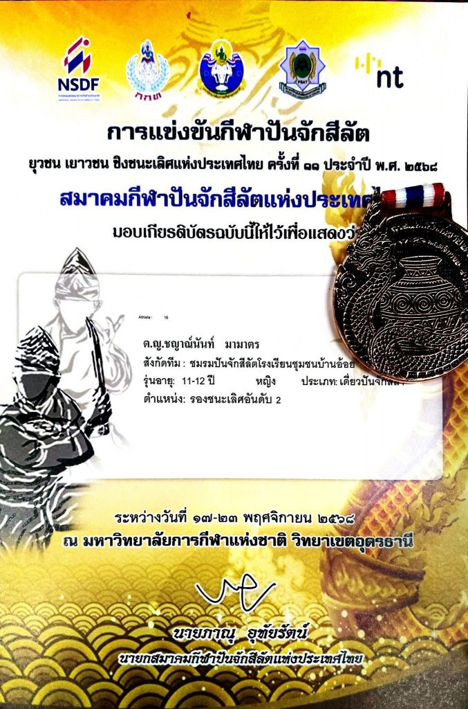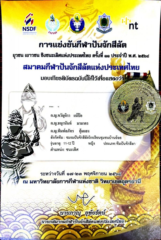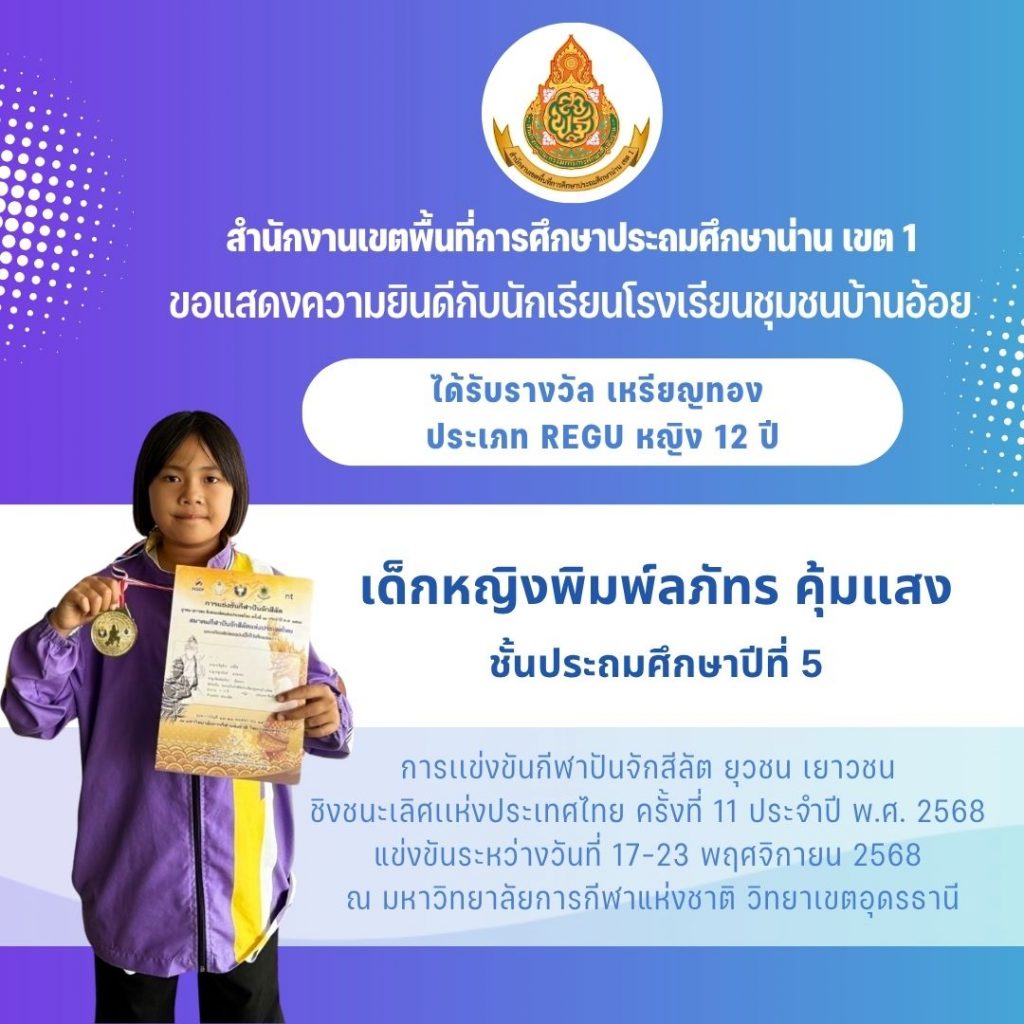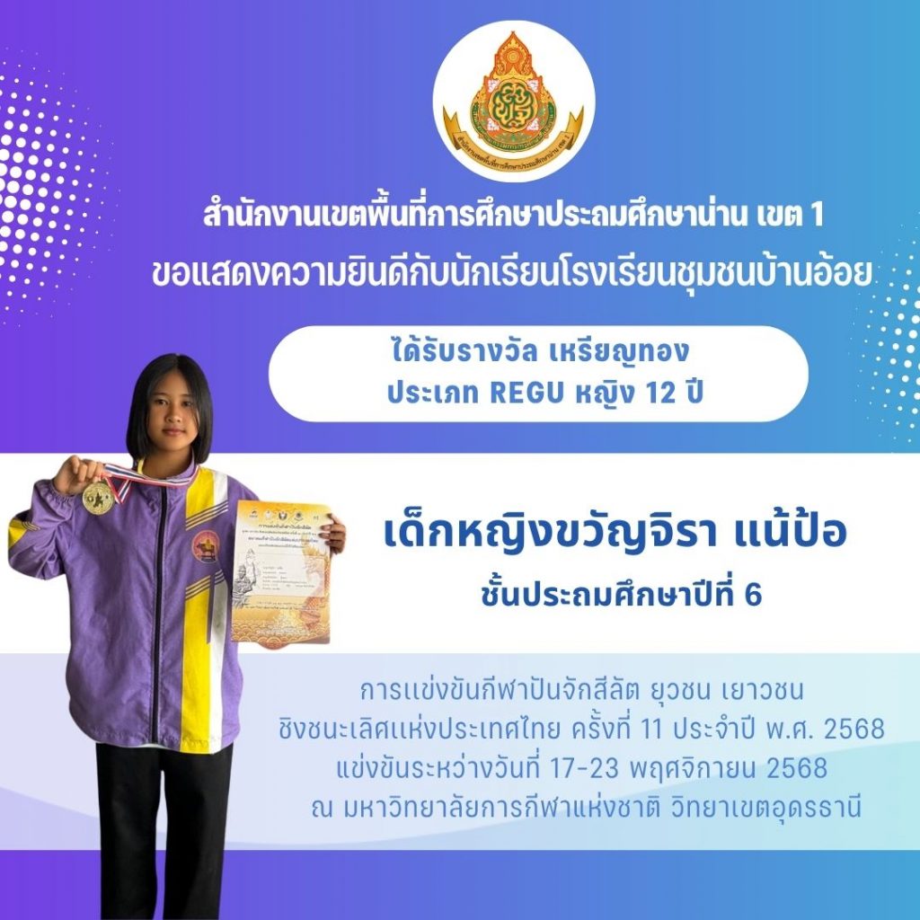 สำนักงานเขตพื้นที่การศึกษาประถมศึกษาน่าน เขต 1 ขอเเสดงความยินดีกับโรงเรียนชุมชนบ้านอ้อย ภายใต้การนำของนายศรันย์ พงษ์รัตนานุกูล ผู้อำนวยการโรงเรียน ที่ได้นำทีมชมรมปันจักสีลัตโรงเรียนชุมชนบ้านอ้อยเข้าร่วมการเเข่งขันกีฬาปันจักสีลัต ยุวชน เยาวชน ชิงชนะเลิศเเห่งประเทศไทย ครั้งที่ 11 ประจำปี พ.ศ. 2568 แข่งขันระหว่างวันที่ 17-23 พฤศจิกายน 2568 ณ มหาวิทยาลัยการกีฬาแห่งชาติ วิทยาเขตอุดรธานี ได้รับรางวัล ดังนี้